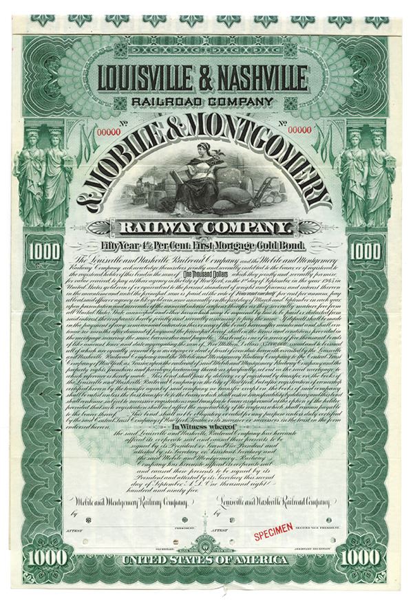 Kentucky, 1895, $1000, 50 Year 4 1/2% 1st Mortgage Gold Specimen Bond, Vertical format, Coupons attached, Allegorical statues on left and right flanking reclined allegorical women on cotton bales, POC's, VF condition, ABNC. Railroad listed but bond unlisted in Cox.