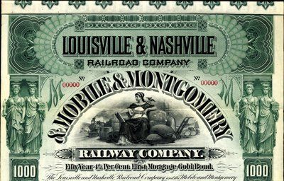 Louisville & Nashville Railroad Co. & Mobile & Montgomery Railway Co. Bond. 1895. $1,000. Specimen 50 Year 1st Mortgage 4-1/2% Gold Bond. Green border. Seated allegorical woman with locomotive flanked by allegorical women in border. Red specimen overprints, POC's and "00000" serial numbers. XF condition. Unlisted rare railroad in Cox. ABNC