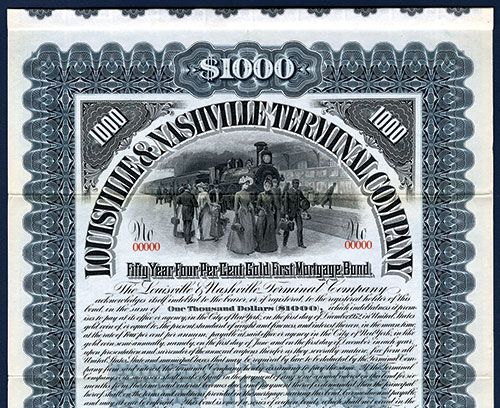 Specimen 1st Mortgage 4%, 50 Year, Gold Bond. Blue border. Train at station with women walking on platform. Coupons attached. Red specimen overprints, POC's and “00000 “ serial numbers. VF condition. Rare and attractive bond. Unlisted railroad in Cox.