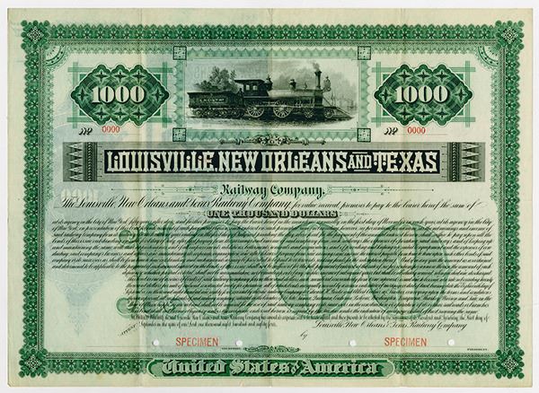 Mississippi. $1,000 Specimen 6% Income Bond, Black print on green border and under tint, Locomotive in profile at top, Specimen overprints and POC's, VF-XF condition, ABNC. Only known as a specimen or proof in Cox. Only 2 examples found in the ABN Archives.
