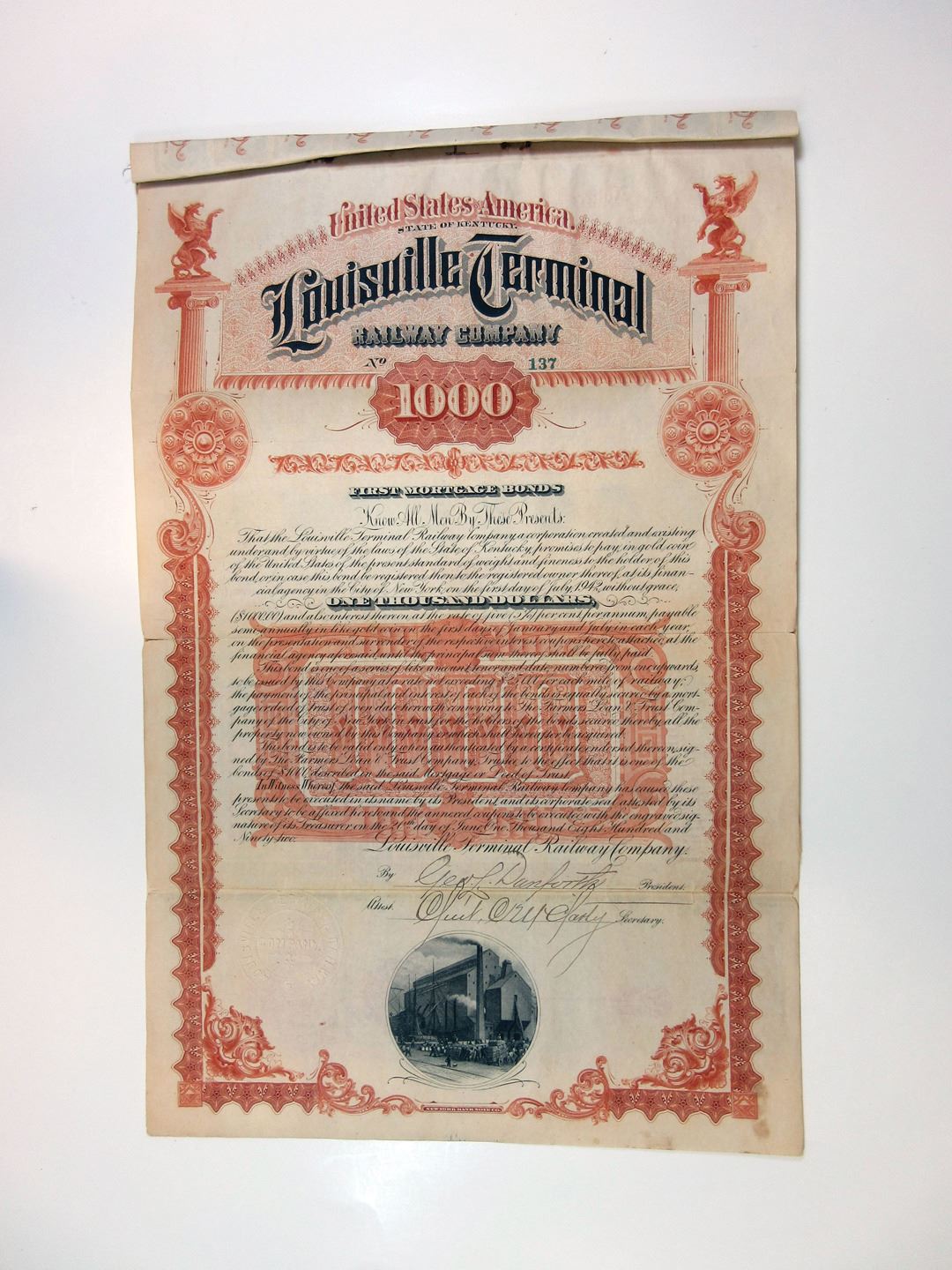 Kentucky. $1,000 I/U 5% 1st Mortgage Coupon Bond, Black print on orange/red border and under tint, Company title at top with small image of Terminal at bottom, Minor splitting along fold lines but otherwise VF condition, NYBNC.