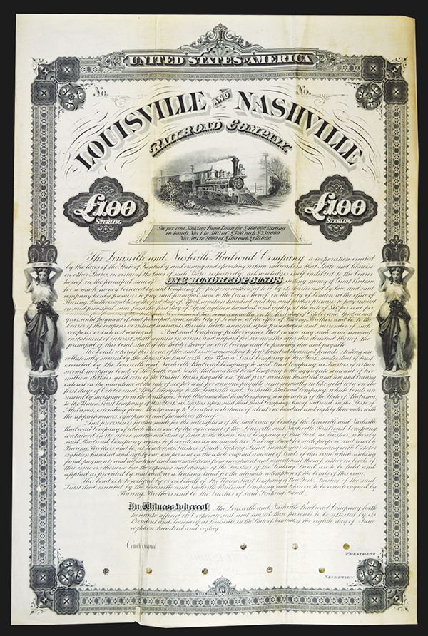 Kentucky, Specimen, 100 Pounds Sterling, 6% Sinking Fund Coupon Bond. Black without underprint, Locomotive L-R under title, Allegorical women on left and right, POC's, archival hand stamp on back, Only known previously as a proof in Cox, not a specimen. This is the only example found in the archives. Unique and rare. ABNC.
