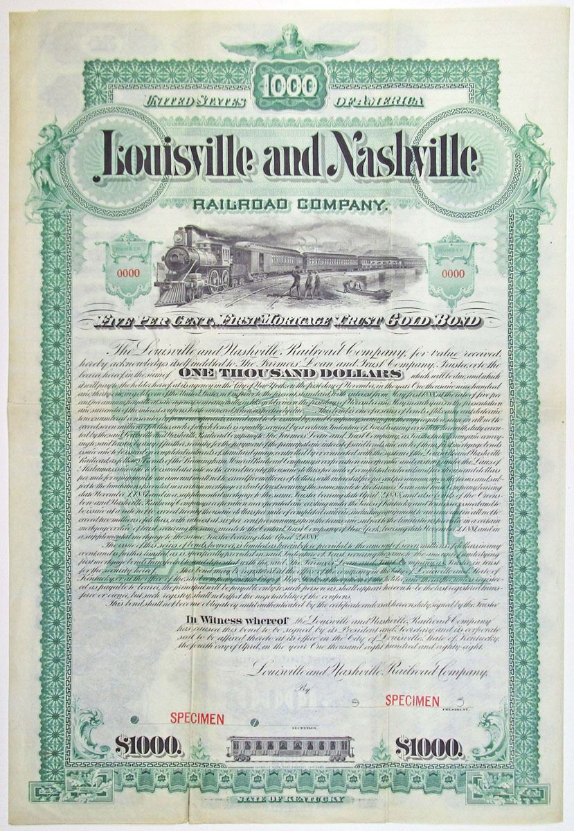 Kentucky, 1888. $1000 Specimen 5% First Mortgage Trust Gold Coupon Bond, Black text with green border and undertint, Train passing by a group of men, one tipping his hat. Red specimen overprints, 0000 serial numbers, and POCs. Fine condition, ABNC. Unlisted design, Rare specimen.