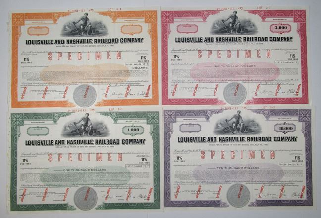 Kentucky, 1975. Lot of 4 Specimen 11% Registered Bonds, Includes $-Odd; $1000; $5000; and, $10,000 denominations in various colors, all have seated allegorical man with gear and industrial scenes behind him, have Specimen overprints and POCs, All in XF-AU condition with punch holes along left margin where they were sown together and removed from booklet, ABNC. (4). Sold "AS IS" no returns accepted.