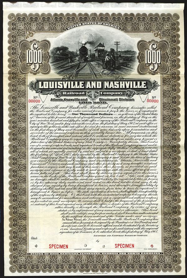 OH. KY. TN. GA. NC, $1000 4% Gold Coupon Bond. Brown border. POC's. Fine condition. Rare and attractive bond. Only listed as a specimen in Cox. ABNC