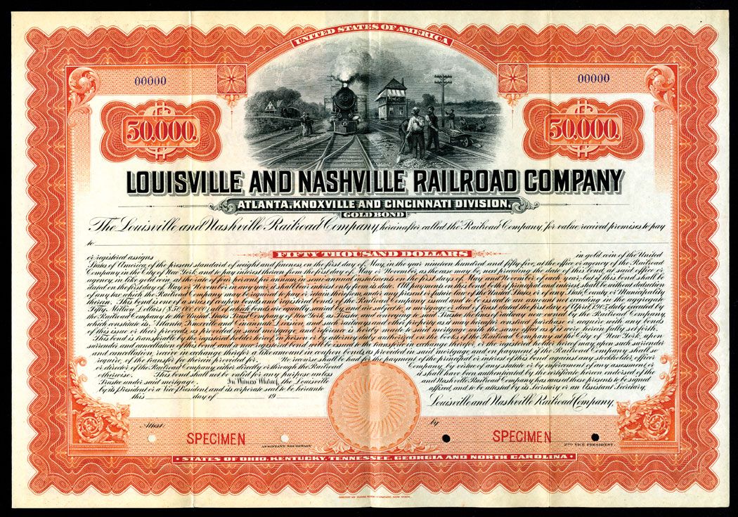 Ohio, Kentucky, Tennessee, Georgia, North Carolina. 1905. $50,000 Registered 4% Gold Bond Specimen. Orange border and underprint. Locomotive head on passing workers. POC's. XF condition. ABNC. This is an unknown bond variety, previously this railroad was represented by only one type of Coupon Bond Specimen, this Registered variety is being offered for the first time and is unlisted in Cox.