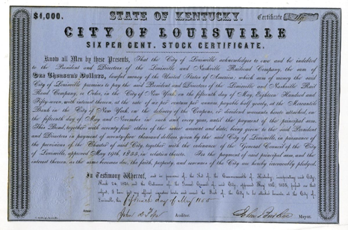 Louisville, Kentucky, 1855. Louisville and Nashville Railroad Co., $1000 I/C 6% Bond, Black on blue paper, S/N 49, VF condition with stains. Signed by John Barbee, the 10th mayor of Louisville and chiefly remembered for his part in the anti-immigrant riots known as "Bloody Monday". Unlisted early date and bond variety in Cox. Rare. Printer: C. Sattle, Louisville.