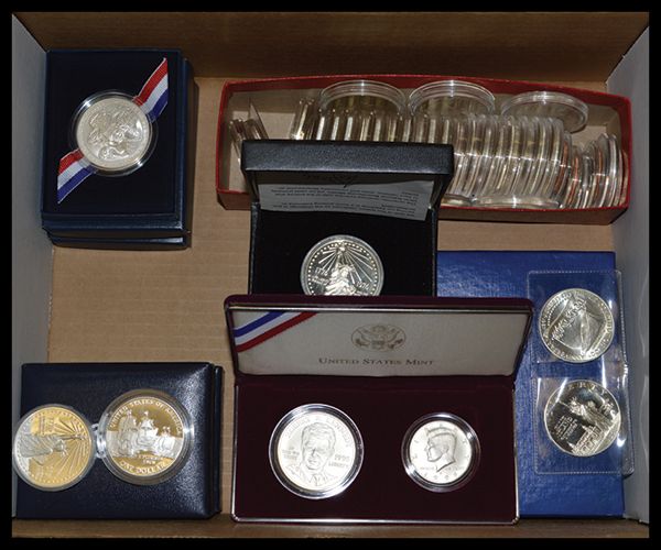 Lovely Assortment of Modern U.S. Commemorative Dollars & Half Dollars. 1976 Bicentennial Proof silver medals(5); 1986 Prestige Proof Set; 1998 Kennedy 2-pc. Set. Dollars include 2001 Buffalo Unc; 2005 Marine Corp Unc; 2012 Star Spangled Banner Unc; plus numerous other Proof and Unc. Commemorative Silver Dollars(34 pcs.) Half Dollars include1982 Washington Proof, 1986 Statue of Liberty Proof & BU, and 2008 Bald Eagle Proof. Also includes a 1922 Peace Dollar AU cleaned. [Total 46 sets and singles] weight approximately 6.5 lbs.