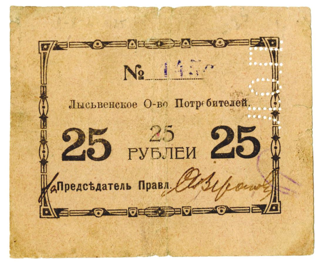 Russia. Lysva Consumer Society. 25 Rubles, perforation canceled. R-17366. VG to Fine condition..