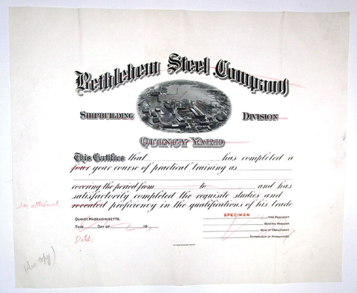 Massachusetts, ca. 1920-50s. Proof Training Certificate for the Bethlehem Steel Company's Shipbuilding Division, Quincy Yard, Black text on white paper, Shipyard depicted at top center. Red specimen overprint and POCs. Various proof annotations made during the design and production process. XF condition, SBN.