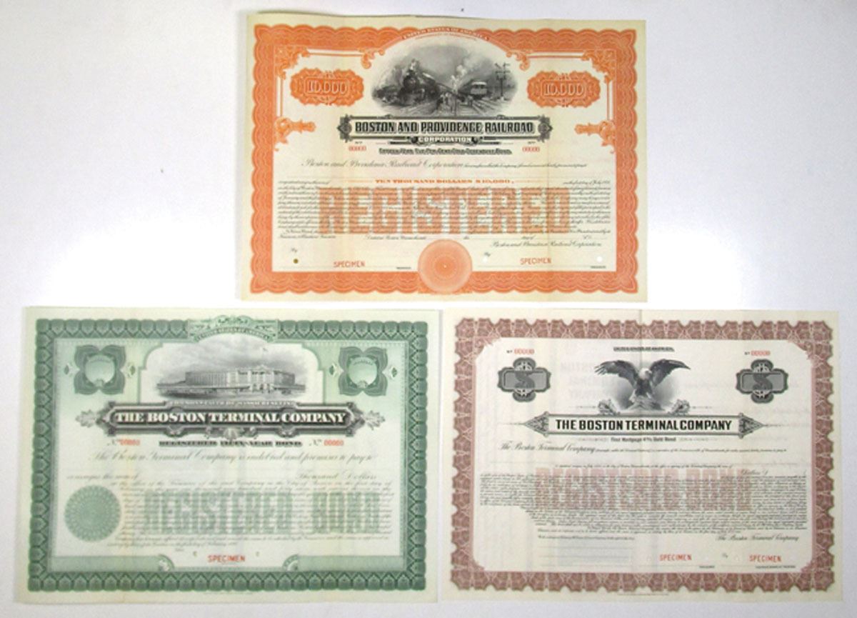 MA, 1897 to 1930. Lot of 3 Specimen Registered Bonds, including Boston Terminal Co., 1897 $Odd 3.5% Bond with green border, South Station Terminal vignette at top center; and 1930 $Odd 4% First Mortgage Gold Bond with brown border, eagle vignette at top center; and Boston and Providence Railroad Corp., 1923 $10,000 5% Gold Debenture Bond with orange border, track workers in between approaching and departing trains at top center. All have 00000 S/Ns and POCs. ABNC and FL-ABNC. (3). Sold "AS IS" No returns accepted. Brown and orange bonds are Unlisted in specimen format in Cox.