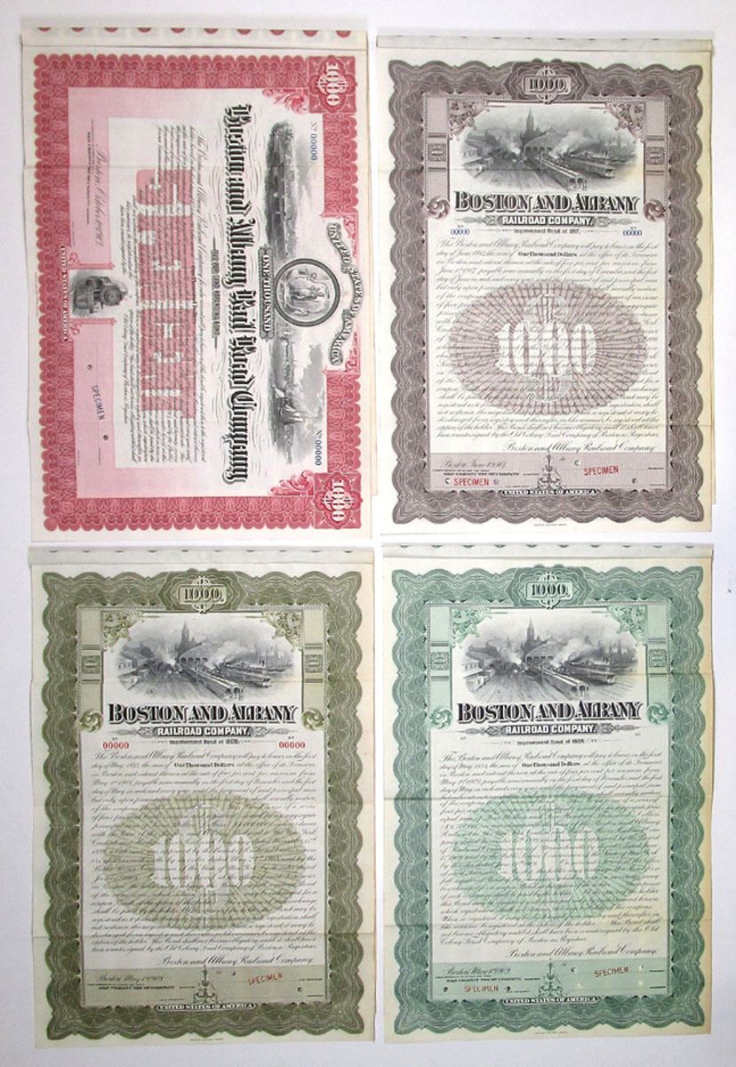 MA, 1908 to 1917. Lot of 4 Specimen $1000 Coupon Bonds, including: 1908 4% Improvement Bond with olive border, Aerial view of train depot at top center; 1909 4% Improvement Bond with green border, same vignette; 1913 5% Refunding Bond with red border, Massachusetts state seal at center flanked by train and harbor scenes; and 1917 5% Improvement Bond with brown border, aerial view of train depot at top center. All have red specimen overprints and POCs. Condition ranges from VF to XF. ABNC. (4). Sold "AS IS" No returns accepted. 1909 Bond is Unlisted in Cox.