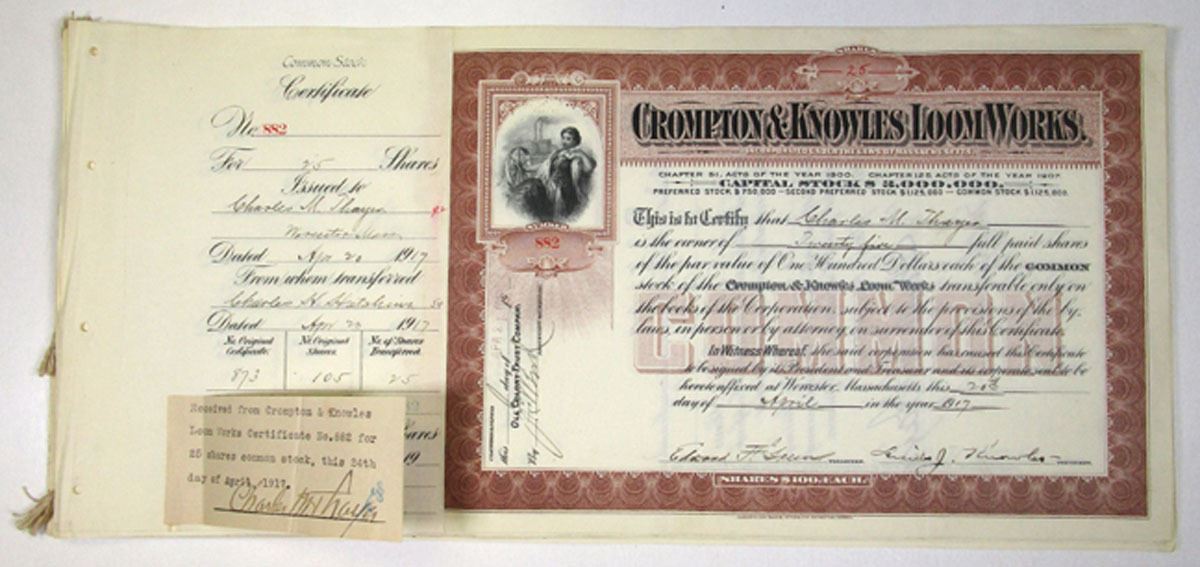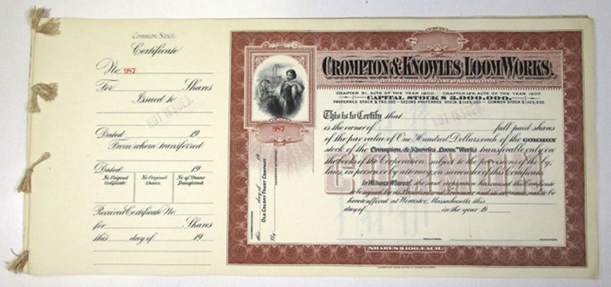 Worcester, Massachusetts, 1913-1916. Lot of 20+, I/C and Unissued Stock Certificates for various share amounts, Black on brown border and underprint with allegorical woman beside spinning wheel with factory in background at top left corner, Each certificate range from VF to XF condition. POC, Counterfoil attached at left, ABNC. (20+). Sold "AS IS" no returns accepted.