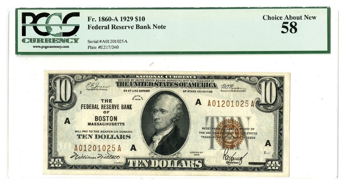 Boston, Massachusetts, 1929. $1, P-396, Fr.# 1860-A, Series of 1929, Issued Banknote, Black print with Hamilton at center, Jones | Woods Signatures, Brown seal at right, S/N A01201025A pp E217/240, PCGS graded Choice About New 58.