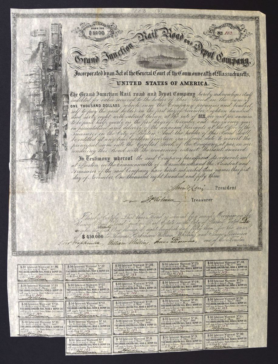 Massachusetts, 1853. $1000 I/U 6% Coupon Bond, Black print with black border, Boats on water under title at top and larger vignette of wharf scene horizontal at top, S/N 103, VF to XF condition, Morse & Tuttle Engravers.