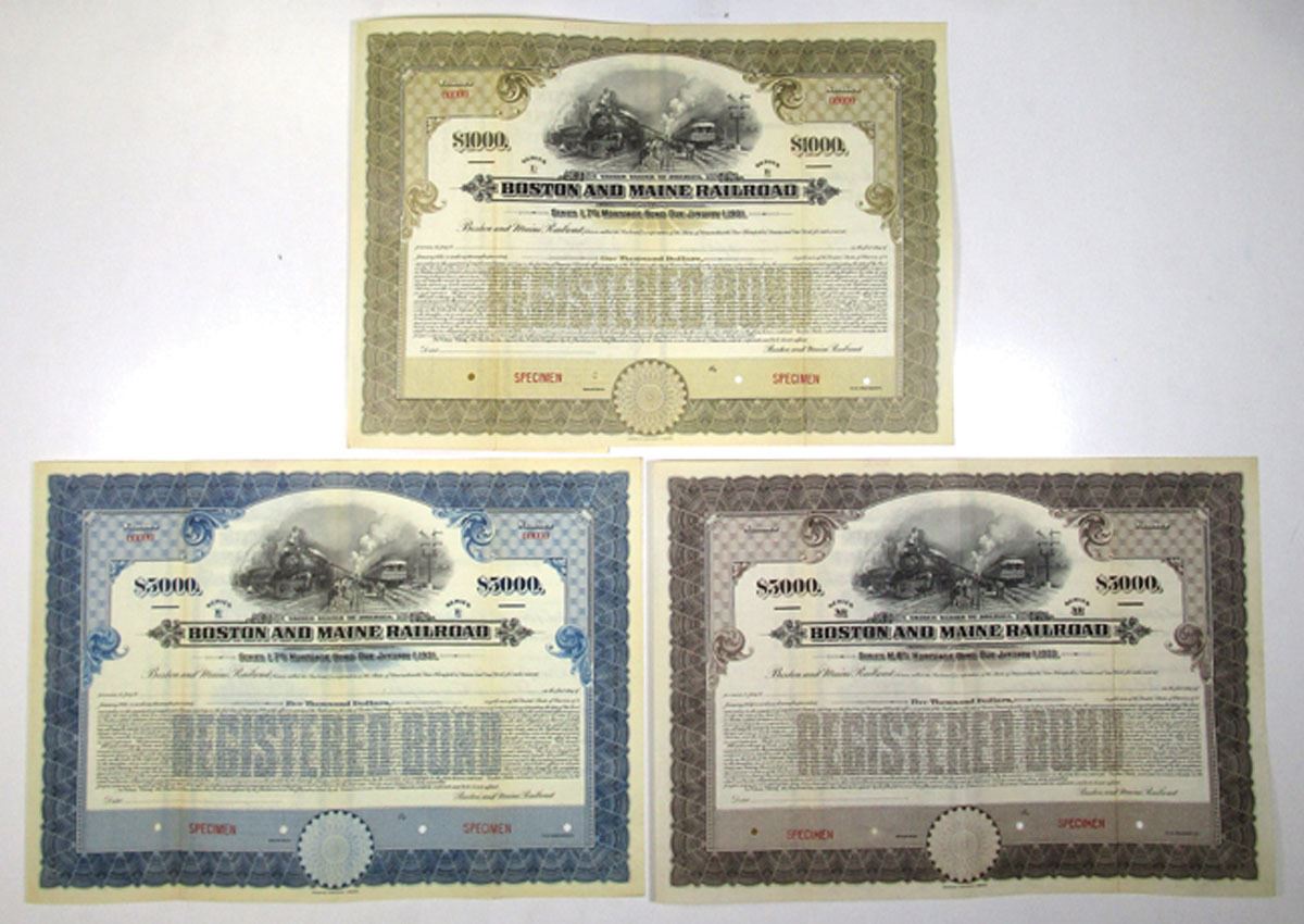MA, NH, ME, NY, 1921 to 1923. Lot of 3 Specimen Registered Gold Bonds, including: 1921 7% Series I Bonds, $1000 with olive border; and $5000 with blue border; and 1923 $5000 6% Series M Bond with brown border, All with same vignette of men working on tracks between approaching and departing trains. All have red specimen overprints and POCs. Condition varies from VF to XF condition. ABNC. (3) Sold "AS IS" No returns accepted. All Unlisted series in Cox.