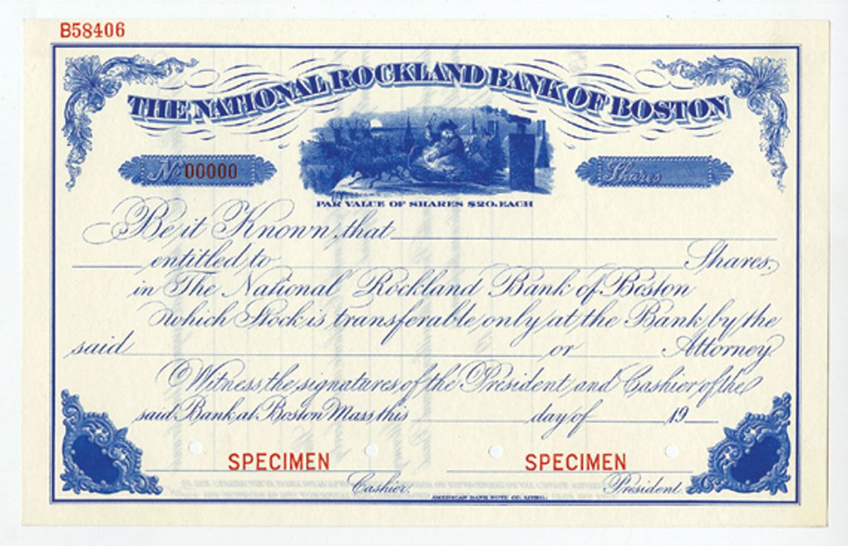 Boston, Massachusetts. ca.1900-1920s, Specimen Stock Certificate, All blue, Santa Claus, his sled full of toys, and his reindeers on a rooftop, shares of $20 each, Order # B58406 in red at top left, ABNC, Uncirculated. Banks and other financial institutions often gave careful consideration to the symbols they selected for use on their bank notes, drafts, and stock certificates. They picked symbols that conveyed a feeling of strength, trust and friendliness to their potential clients, and that is precisely why the officers of the National Rockland Bank of Boston chose Santa Claus. This universal symbol of trust and friendship is highly coveted by collectors, and opportunities to obtain certificates like these are few and far between. Don't miss this rare opportunity.