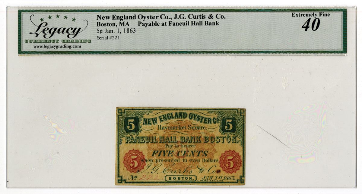 Boston, Massachusetts, January 1, 1863. 5 Cents I/U Obsolete Banknote, Green and red print with brown underprint, Note is payable at Faneuil Hall Bank, S/N 221, Legacy graded Extremely Fine 40 with comment "Small Rust Stain near Bottom Right," L. Prang & Co. Lith.