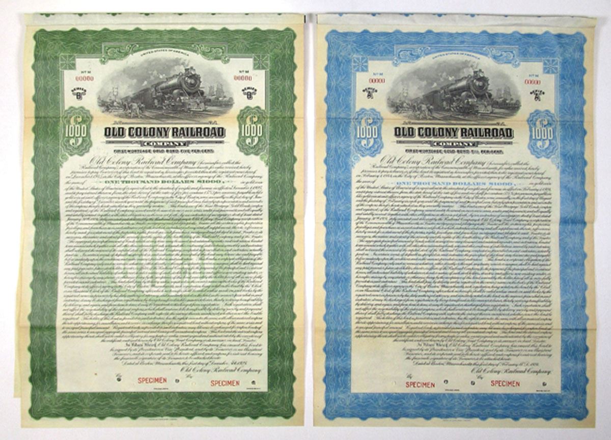 MA, 1924 and 1925. Lot of 2 Specimen $1000 First Mortgage Gold Coupon Bonds, including: 1924 5.5% Series A Bond with light blue border; and 1925 5% Series B Bond with green border, both with same vignette of men working near approaching train. Red specimen overprints, 00000 S/Ns, and POCs. Condition ranges from VF to XF. ABNC. (2). Sold "AS IS" No returns accepted.