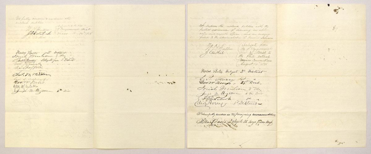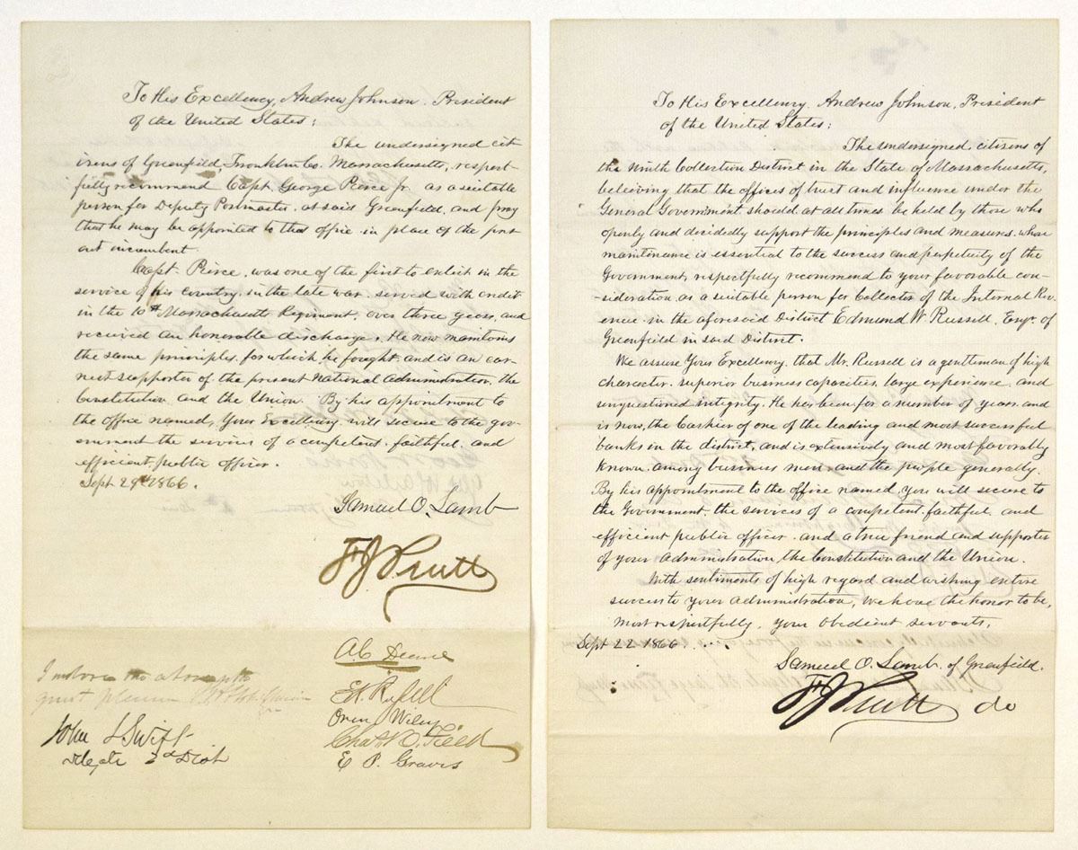 Massachusetts, September 22 and September 29, 1866. Lot of 2 original handwritten letters addressed to President Andrew Johnson concerning federal appointments in Greenfield, Massachusetts, including recommendations for Edmund W. Russell as Collector of Internal Revenue and Capt. George Pierce Jr. as Deputy Postmaster. Both letters originate from citizens of Franklin County and advocate for candidates based on loyalty, service, and qualifications following the Civil War. Each is signed by Samuel O. Lamb and John T. Swift, along with numerous additional endorsers (approximately 10 to 20 signatures per document). Conditions range from VF to XF overall, with typical folds, light toning, and minor handling. (2). Sold “AS IS” no returns accepted.
