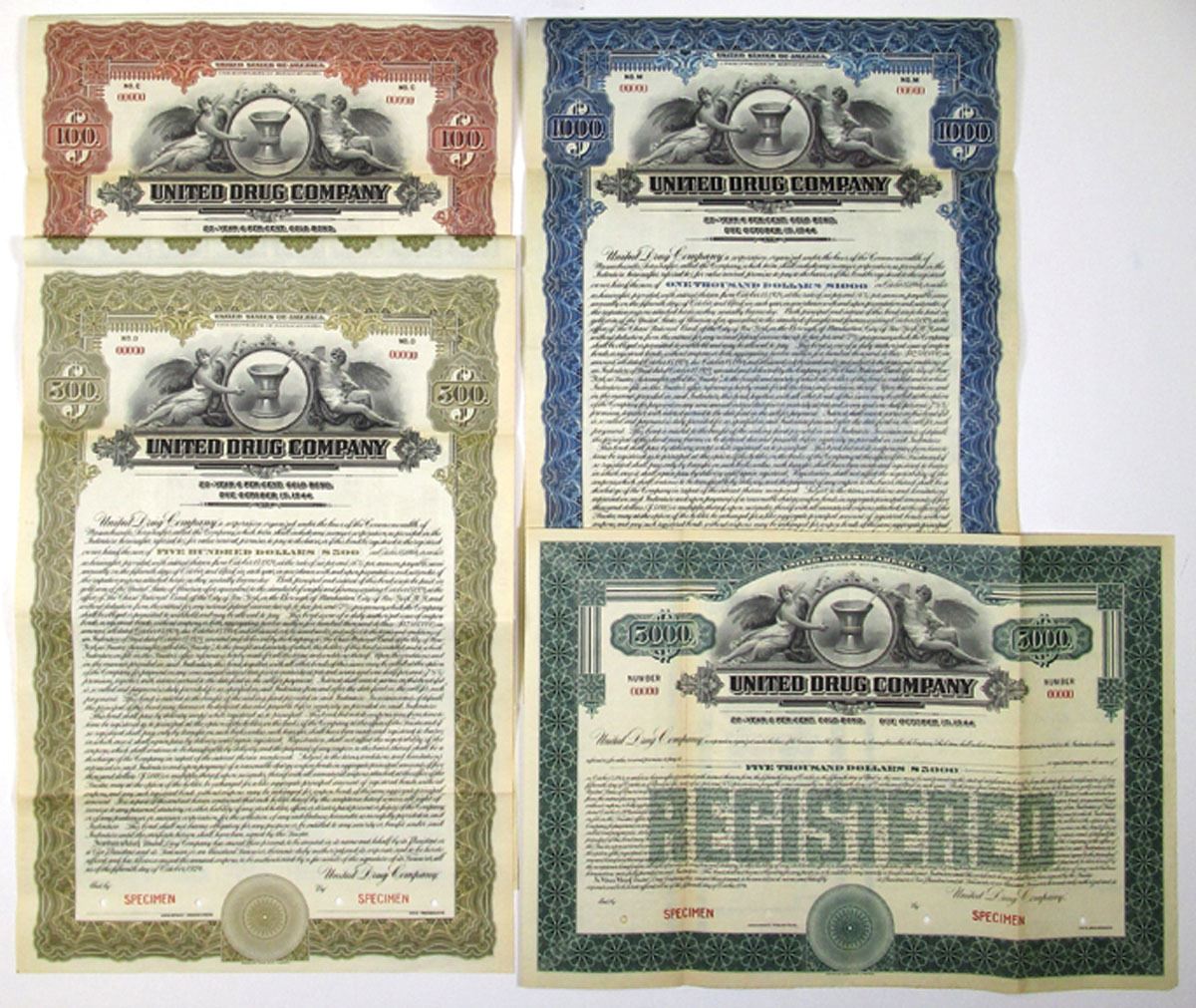 Massachusetts, 1924, Lot of 4 Specimen Bonds, Includes: $100 6% Twenty Year Gold Coupon Bond, Black with brown border; $500 6% Twenty Year Gold Coupon Bond, Black with olive green border; $1000 6% Twenty Year Gold Coupon Bond, Black with blue border; and, $5000 Registered 6% Twenty Year Gold Bond, Black with green border. All bonds have winged figures at top flanking mortar and pestle above company title, Specimen overprints, POCs, are in VF to XF condition, printed by ABNC. (4). In 1903, Louis K. Liggett persuaded 40 independent drug stores to invest $4,000 (~$108,927 in 2023) in a retailers' cooperative called United Drug Stores, which sold products under the Rexall name. Justin Whitlock Dart, formerly of the Walgreens drugstore chain, took control of Boston-based United Drug Company in 1943. The chain operated under the Liggett, Owl, Sonta, and Rexall brands, which Dart rebranded under the Rexall name. Historic bond assortment from this famous drug and drugstore company.