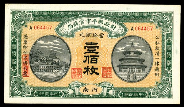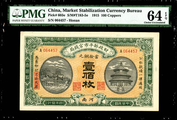 China, 1915, 100 Coppers, P-603e, S/M#T183-5e, PMG graded CU 64 EPQ.