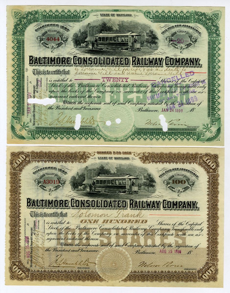 Baltimore, Maryland. 1898-1899, Lot of 2 stock certificates, 20 Shares, green border, I/C; and 100 Shares, I/U, brown border. VF to XF condition, Franklin BNC. (2)