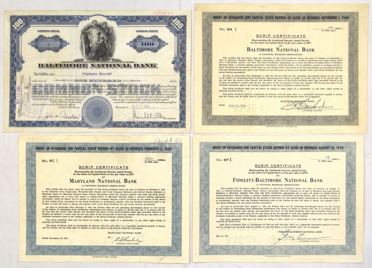 Maryland, 1934-61. Lot of 4 I/C Serial #1 Stock Certificates, Includes:1934, Baltimore National Bank, 100 Shares Common Stock; 1959, Fidelity-Baltimore National Bank, 6/10s Share Scrip Receipt; 1960, Baltimore National Bank, 4/10ths Scrip Certificate; 1961, 800/1000ths Scrip Certificate. All are S/N 1 and have Pin Punched Cancelled, Certificates range from Fine to VF+ condition. (4). Sold "AS IS" no returns accepted.