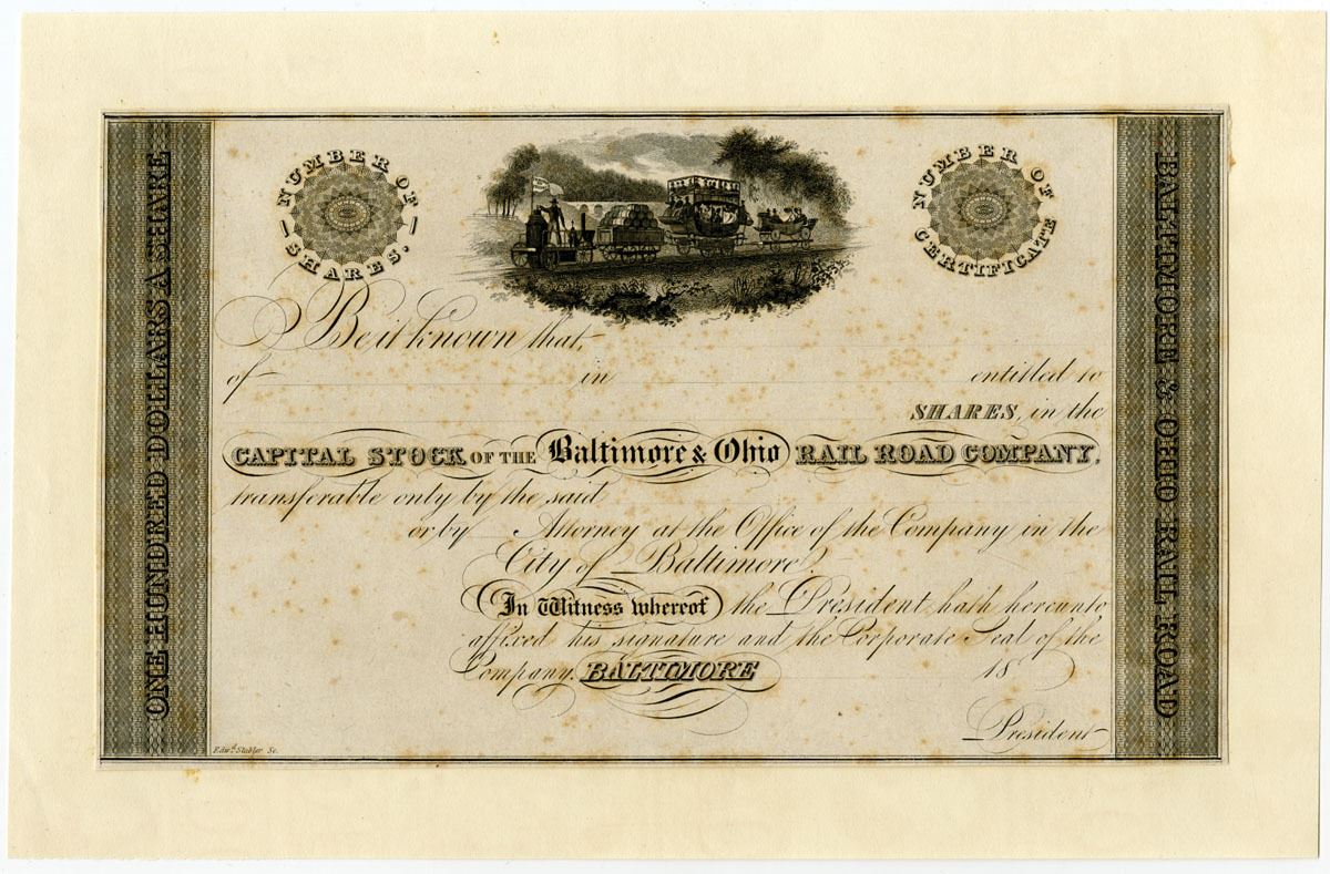 Baltimore, Maryland, ca.1830s. Lot of 2 Items, Includes: Proof Stock Certificate with light foxing and Letter from the law offices of John K. Cowen and E. J. D. Cross signed by Cross. Uncirculated condition. No similar designs of this certificate have been found at auction or offered previously at auction, the design has 2 numeral medallions flanking the early Locomotive design in middle, All other B&O railroad certificates have vignettes flanking the central locomotive vignette, none have the medallions. Also, all known B&O certificates were printed by a security printer, this design is by Edward Stabler. Born in Maryland in 1794, Edward Stabler was self-taught and began his career engraving jewelry at the age of 16. By the time he retired in 1863, Stabler had designed seals for nearly every department in the Federal Government, several states, cities, and many businesses.