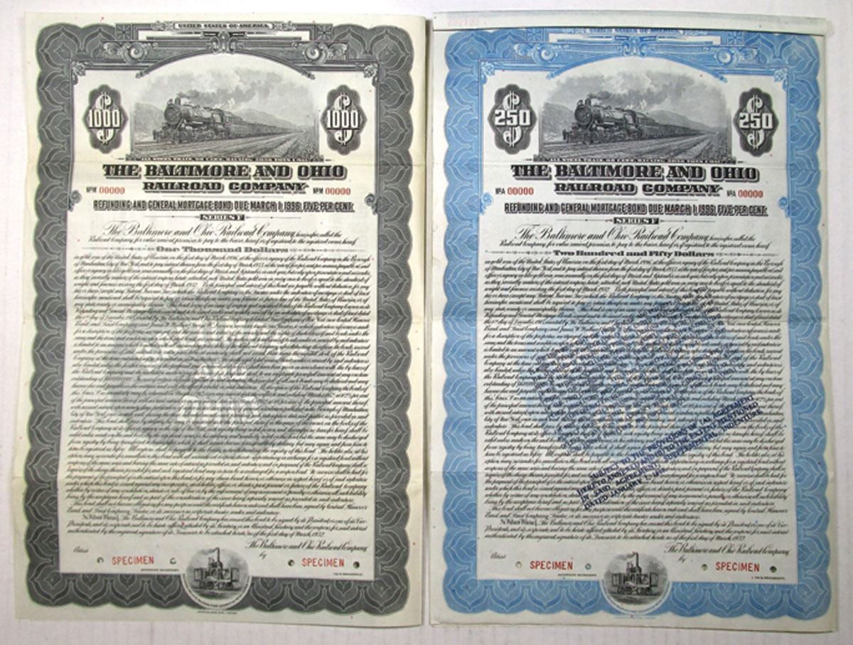 Maryland, 1932. $250 and $1000, Lot of 2, 5% Refunding and General Mortgage Series F Coupon Bonds in Blue and Gray. Both have Specimen overprints, POCs, are in VF to XF condition, ABNC. (2). Sold "AS IS" no returns accepted. The $250 bond is unlisted as a reissued bond with an overprinted "Gold Standard" change text in 1933.