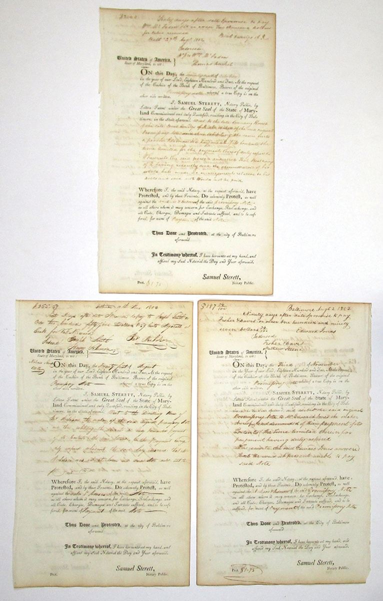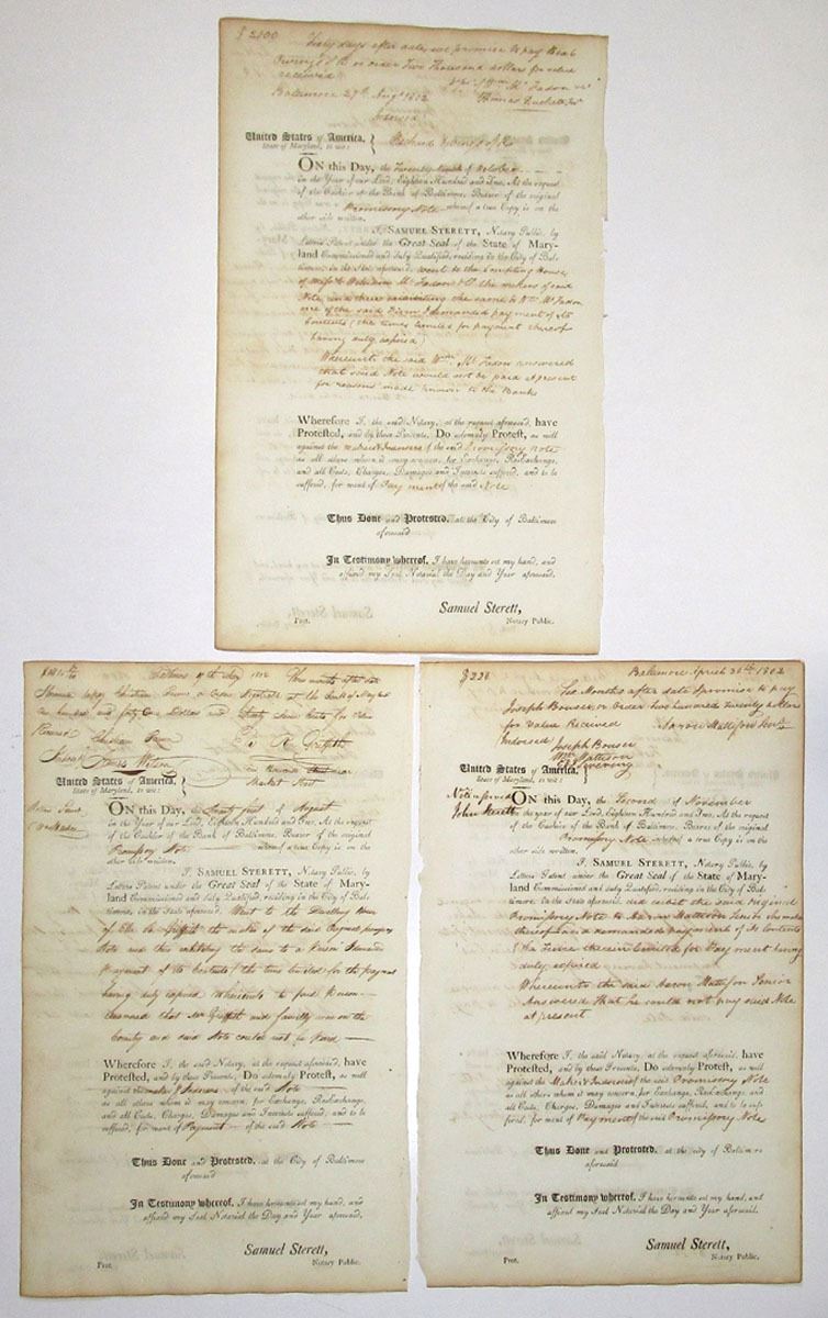 Maryland, 1802. Lot of 3 pieces, all double-sided: All are Promissory Notes (6 total on 3 double sided pages) from Samuel Sterett, Notary Public, each for $2000; $2000; $255.59; $141.67; $220; and $197.34, respectively. Black text with dark brown handwriting. Each promissory note outlines the terms and conditions of the promised payment. VF condition for its age, with slight toning around edges, and rough edges where the pages were torn from a book. Samuel Sterett (1758 - July 12, 1833) was a Representative from the fourth congressional district of Maryland. Sterett was elected to the Maryland State Senate in 1789. Following his service in the State Senate he was elected to the Second Congress (March 4, 1791 - March 3, 1793), during which he also served as secretary of the Maryland Society for Promoting the Abolition of Slavery in 1791. In 1812 Sterett became a member of the Baltimore committee of safety. He also served as captain of an independent company at the Battle of North Point September 12, 1814. Sterett was grand marshal in Baltimore at the laying of the foundation stone of the Baltimore & Ohio Railroad on July 4, 1828. Interesting group of documents from early United States history.