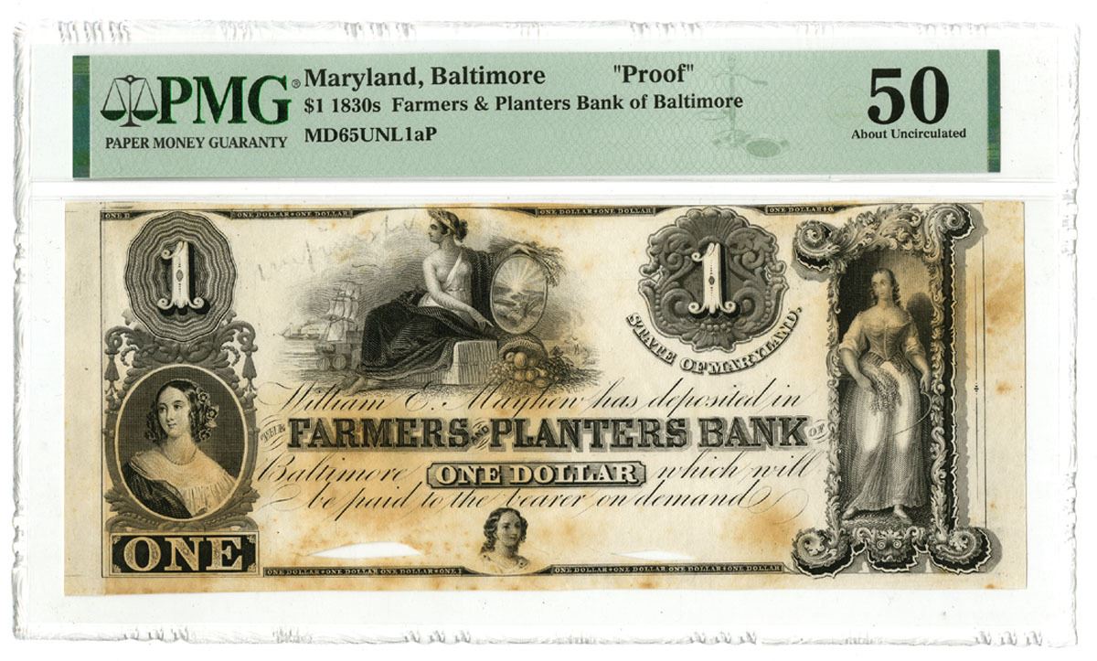 Baltimore, Maryland, ND (1830s). $1, MD65UNL1aP, Proof Banknote, Black printing with allegorical woman at top center and left and right sides, Cut outs by signature at bottom, PMG graded About Uncirculated 50 with comment "Signatures Cut Out and Stains, Mounting Remnants." This is one of only two examples of this note listed in the PMG census of obsolete banknotes. From a new estate find that had been in the family since the 1890s. This is the first time this note has been offered at public auction..