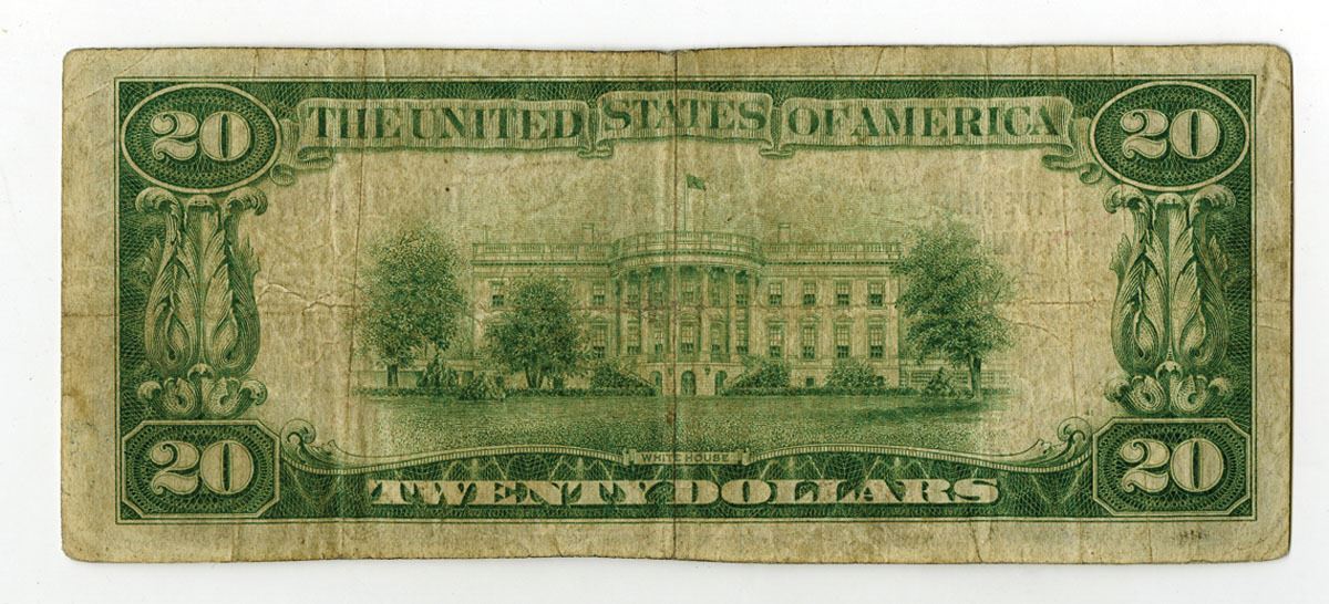Gaithersburg, Maryland, 1929. $20 T1, Series of 1929, Ch# 4608, Fr.# 1802-1, Jones | Woods Signatures, Small brown seal at right, S/N B000139A pp B8/41, Fine to VF condition. Only 5 examples are reported for the $20 T1 out of a total of 17 small notes of all denominations reported on the entire bank.