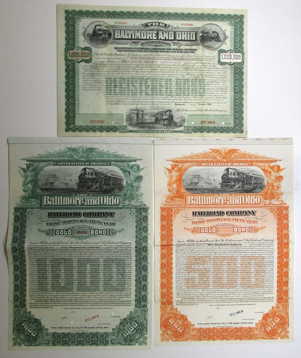Maryland, 1898-1913. Lot of 3 Specimen Bonds, Includes: $1,025,000 Registered Pittsburg Junction and Middle Division First Mortgage 3 1/2% Gold Bond with Green border, 1898, ABNC; $500 First Mortgage Fifty Year Gold Coupon Bond with Orange border, 1913, IBNC; $1000 First Mortgage Fifty Year Gold Coupon Bond with Green border, 1913, IBNC. All have Specimen overprints, POCs, and range from Fine to VF+ condition. Sold "AS IS" no returns accepted.