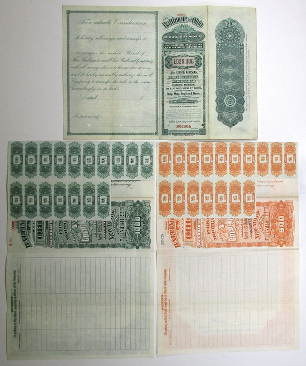 Maryland, 1898-1913. Lot of 3 Specimen Bonds, Includes: $1,025,000 Registered Pittsburg Junction and Middle Division First Mortgage 3 1/2% Gold Bond with Green border, 1898, ABNC; $500 First Mortgage Fifty Year Gold Coupon Bond with Orange border, 1913, IBNC; $1000 First Mortgage Fifty Year Gold Coupon Bond with Green border, 1913, IBNC. All have Specimen overprints, POCs, and range from Fine to VF+ condition. Sold "AS IS" no returns accepted.