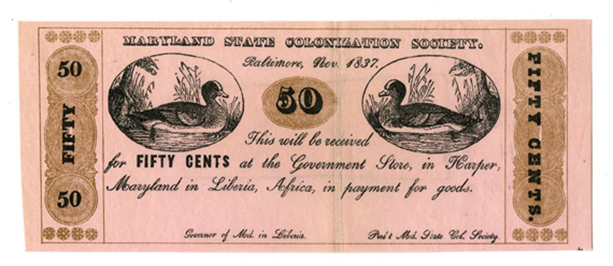 Maryland, 1837. 50 Cent Store Voucher good for use at General Store in Harper Maryland in Liberia Africa, Black print with brown underprint on pink paper, Vignettes of ducks at left and right. VF to VF+ condition with archival reinforcement and repair of vertical middle split that is very unobtrusive and difficult to view. The Maryland State Colonization Society (MSCS) was a state-funded organization (1831–1902) that forcibly "re-settled" free and manumitted Black Marylanders in a colony called Maryland in Liberia, established in Africa. This effort, part of the larger American Colonization Society movement, aimed to remove Black people from the state and was supported by state appropriations and voluntary emigration, though many emigrants faced difficult conditions. The society dissolved in 1902, and Maryland in Liberia eventually joined the Republic of Liberia in 1857.