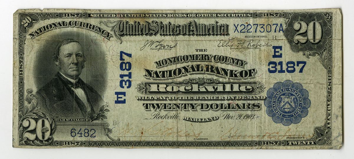 Rockville, Maryland, 1903. $20 DB, Series of 1902, Ch# E-3187, Fr.# 642, Lyons | Roberts Signatures, Blue scalloped seal at right, S/N 6482-X227307A pp B, Fine to VF condition. This note is listed in the T&P census, 1 of only 2 examples reported.