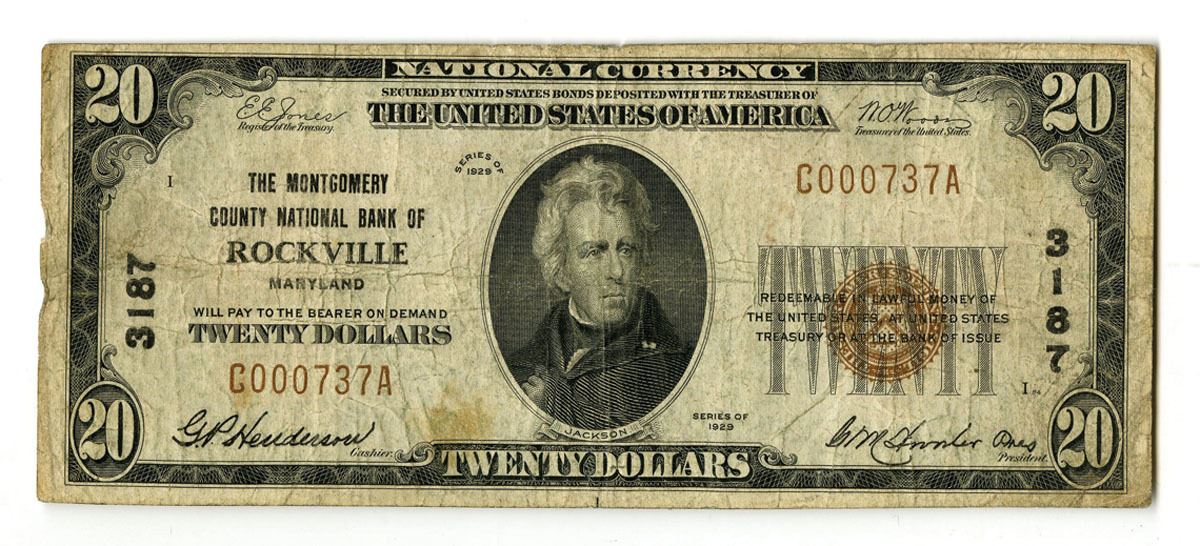 Rockville, Maryland, 1929. $20, Series of 1929, Fr.# 1802-1, Ch# 3187, Jones | Woods signatures, Brown scalloped seal at right, S/N C000737A, Fine condition with high wear on back. BEP.