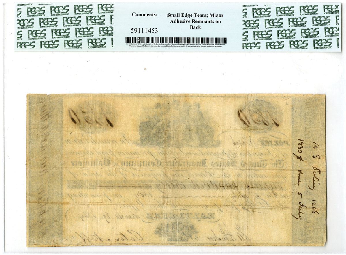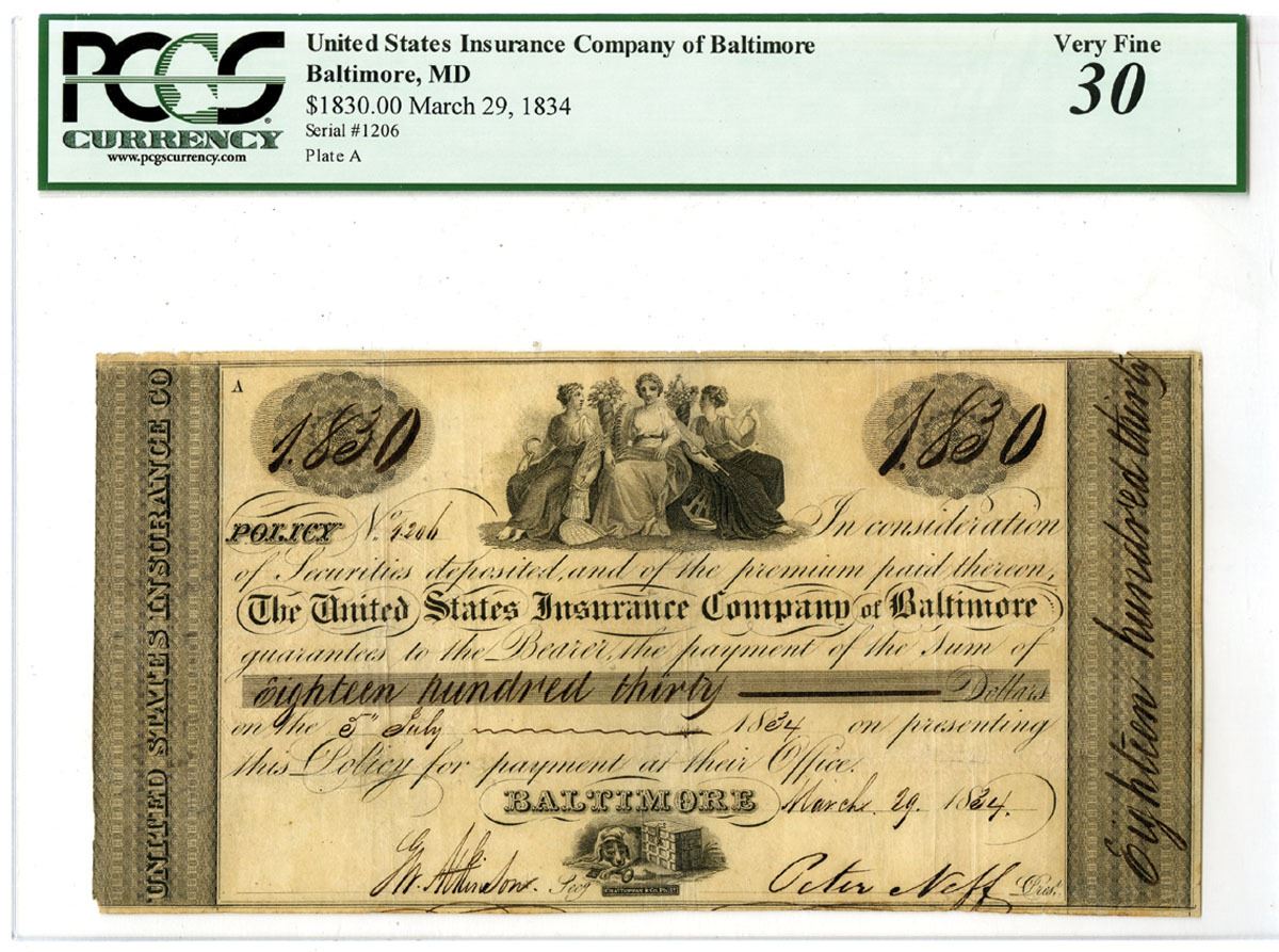 Baltimore, Maryland, 1834. Issued Insurance promissory note Payout for $1,830 to be paid out on July 5, 1834, Black print with trio of women at top center, S/N 1206 pp A, PCGS graded Very Fine 30 with comments "Small Edge Tears; Minor Adhesive Remnants on Back, CTC.