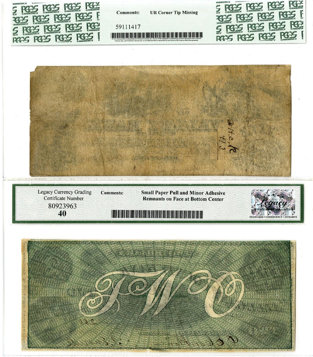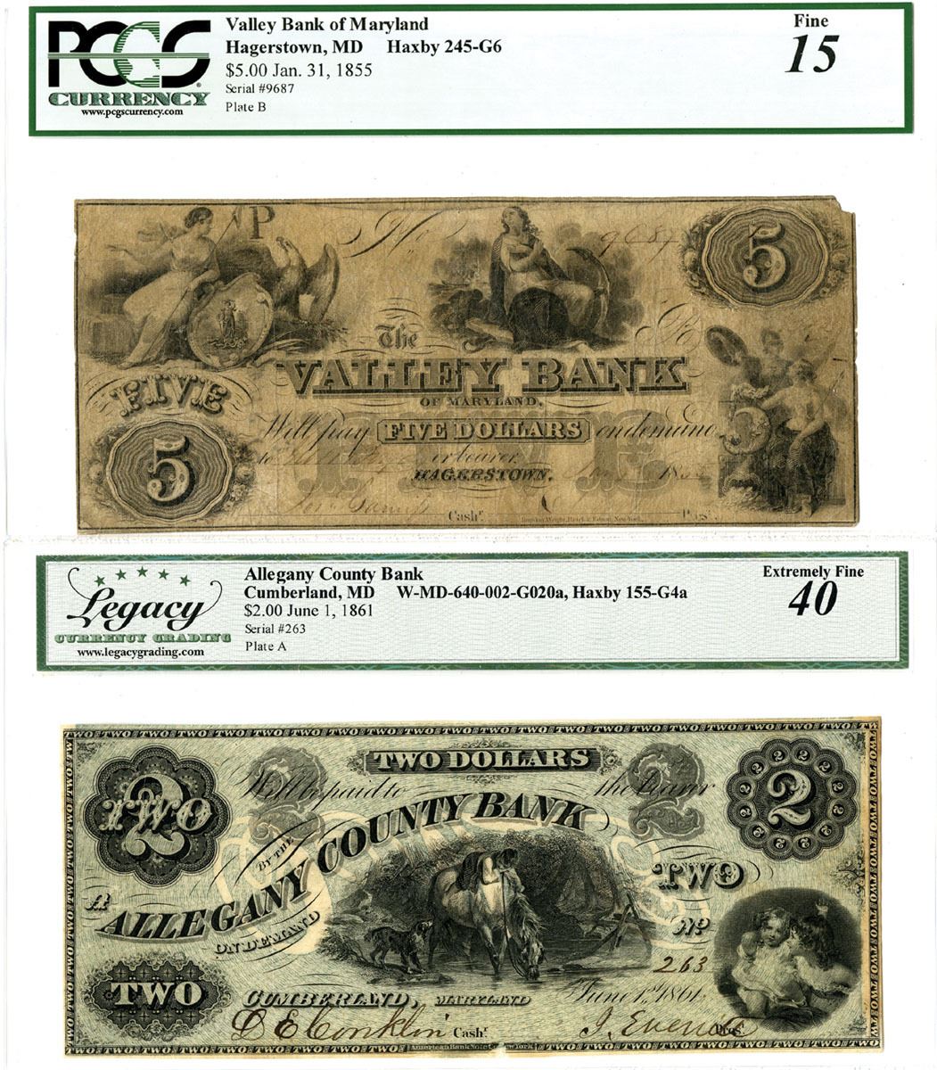 Maryland, 1855 and 1861. Lot of 2 Issued Banknotes Includes: January 31, 1855, Valley Bank of Maryland $5, Haxby 245-G6, S/N 9687 pp B, PCGS graded Fine 15 with comment "UR Corner Missing," RWH; June 1, 1861, Allegany County Bank $2, W-MD-640-002-G020a, Haxby 155-G4a, S/N 263 pp A, Legacy graded Extremely Fine 40 with comment "Small Paper Pull and Minor Adhesive Remnants on Face at Bottom Center," ABNC. (2). Sold "AS IS" no returns accepted.
