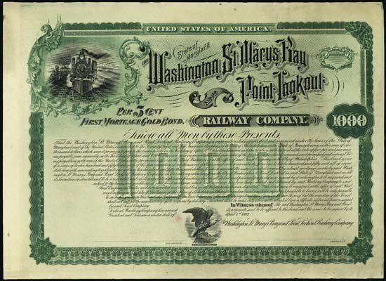 Specimen bond. 1897. $1000. 1st Mortgage 56% Gold Bond. Green border. Locomotive coming straight on at UL with fancy title and eagle on bottom. No coupons attached. XF condition. T.A.Bradley, printer. Listed railroad, but unlisted as bond in Cox. Extremely rare and attractive Maryland railroad bond. No cancellations, but from SBNC archive (They acquired T.A. Bradley in the 1890's-1900's). Only one specimen stock is known for this railroad, this is the second example of any kind of certificate known. No issued examples have been found.