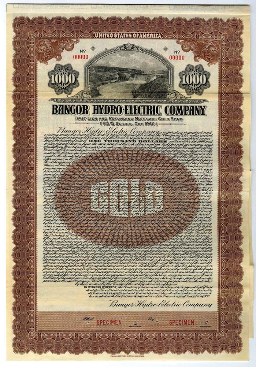 Maine. $1000 Specimen 4 1/2% 1st Lien and Refunding Mortgage Gold Coupon Bond, Black print on brown border and under tint, Hydro plant with waterfall at top, Specimen overprints and POC's, VF-XF condition, FL-ABNC.