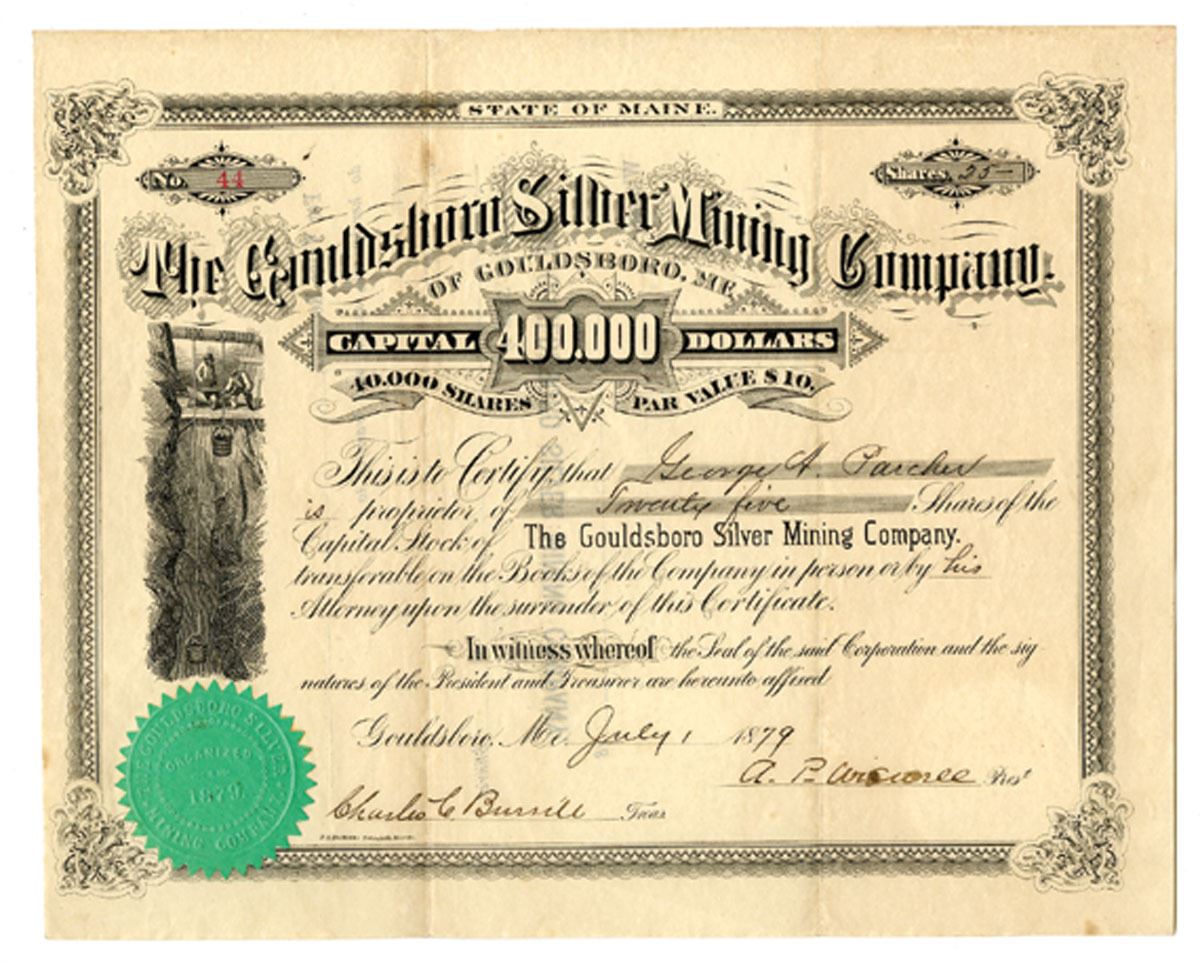 Gouldsboro, Maine, 1879. 25 Shares, I/U Capital Stock Certificate, Black print with black border, Mining scene along left margin, Green seal at bottom left, S/N 44, VF condition. J. H. Bufford's Son & Lith.