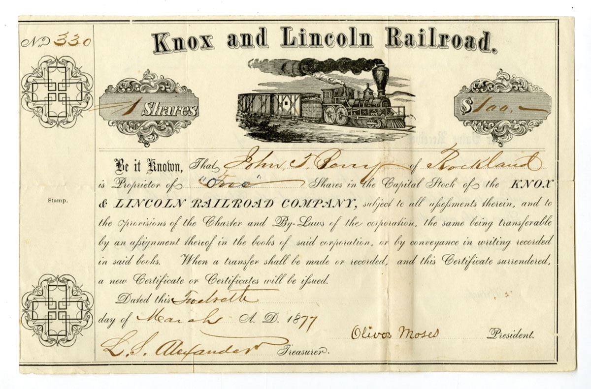 Maine, 1877. 1 Share Capital Stock I/U Certificate, Black print with simple black border and train vignette at top center, S/N 330, Small sized certificate, VF to VF+ condition with archival repairs on back.