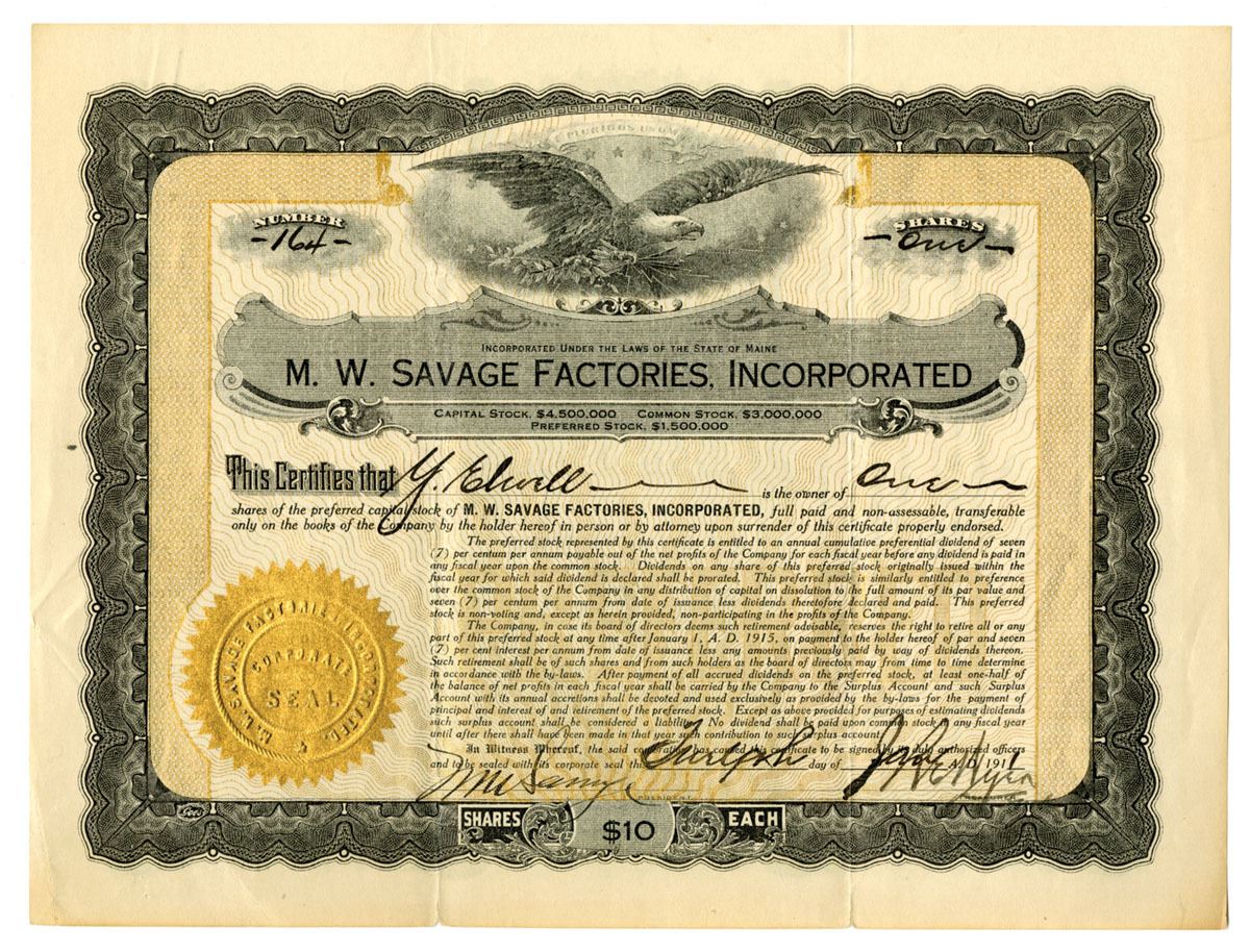 Maine, 1911. 1 Share Preferred Capital Stock I/U Certificate, Black print with black and bronze border with bronze underprint, Bald Eagle gripping arrows at top center with gold embossed seal at bottom left, S/N 164, VF to VF+ condition with slight splitting at fold lines. Certificate is signed by company founder, Arthur William Savage. M.W. Savage Factories, Inc. refers to the early 20th-century business empire of Marion W. Savage, a Minnesota entrepreneur famous for his International Stock Food Company, the famous racehorse Dan Patch, and diverse manufacturing ventures like sewing machines and furniture, later consolidated by his son Erle B. Savage around 1911.