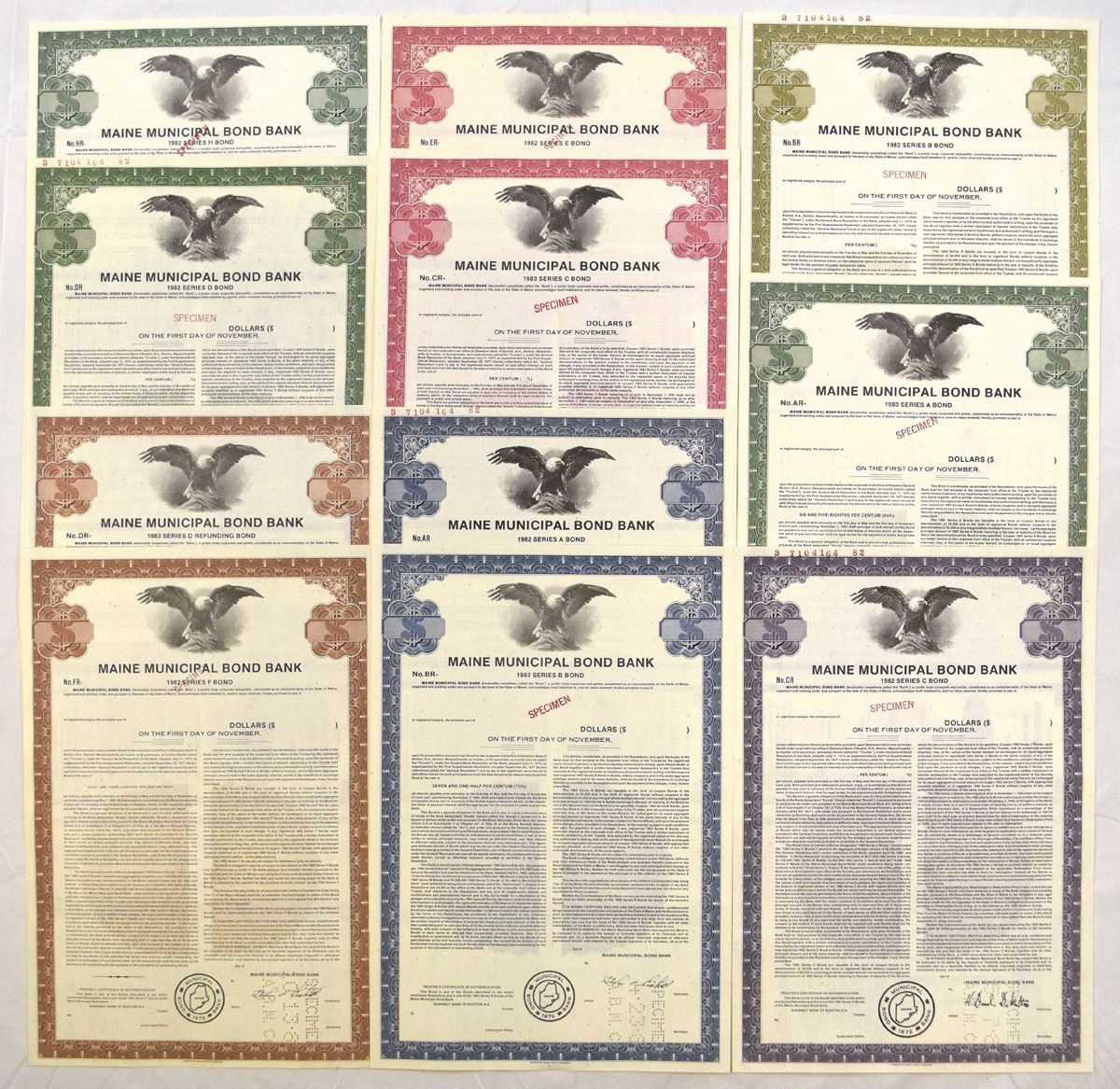 Maine, 1982-1983. Lot of 11 Specimen Bonds representing multiple series including Series A, Series B, Series D Refunding, and Series S, Printed in various color schemes including green, red, brown, blue, and purple, each featuring the large eagle vignette at top center with ornate border designs, Condition ranges from AU to UNC condition. (11). Sold "AS IS" no returns accepted.