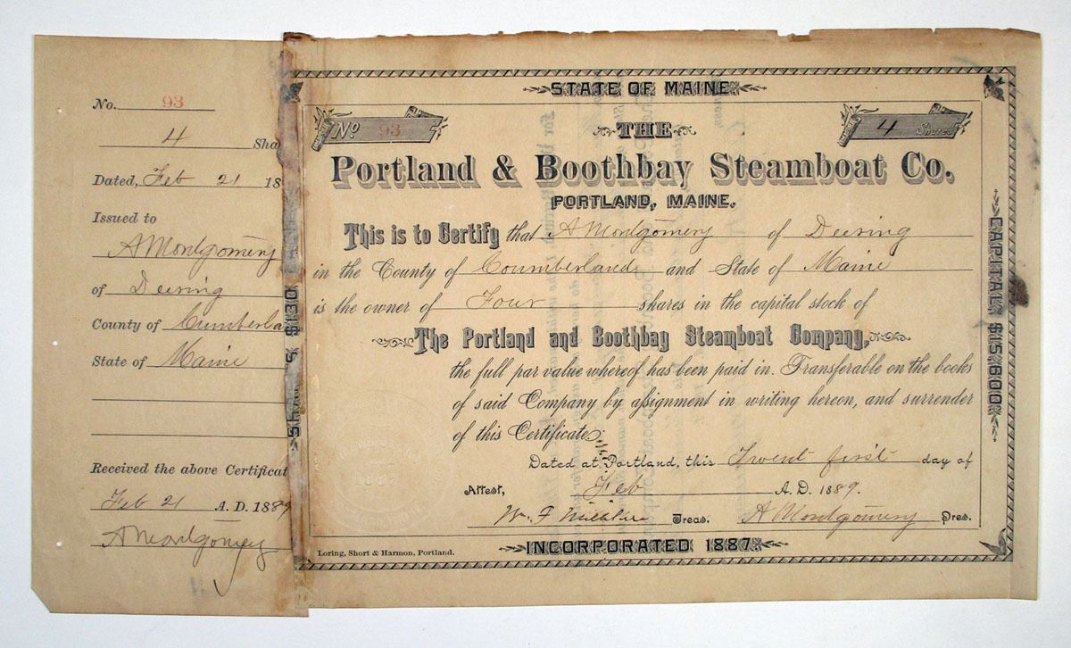 Portland, Maine, 1889. 4 Shares I/U Stock Certificate, Black on simple black border with company title at top, S/N 93, Fine condition with staining on the margins, toning and slight edge faults.