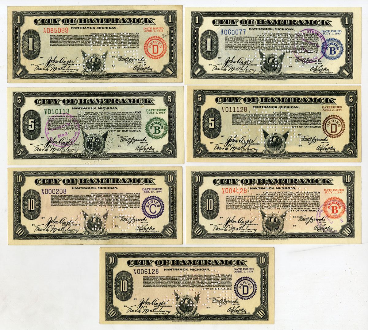Hamtramck, Michigan, 1933-34. Lot of 7, I/C Depression Scrip, Includes: $1, Series B & Series D; $5, Series B & Series D; $10, Series B, Series C, & Series D. Notes are in XF to Uncirculated or better condition. (7). Sold "AS IS" no returns accepted.