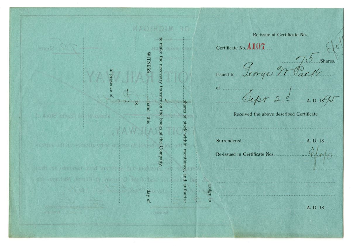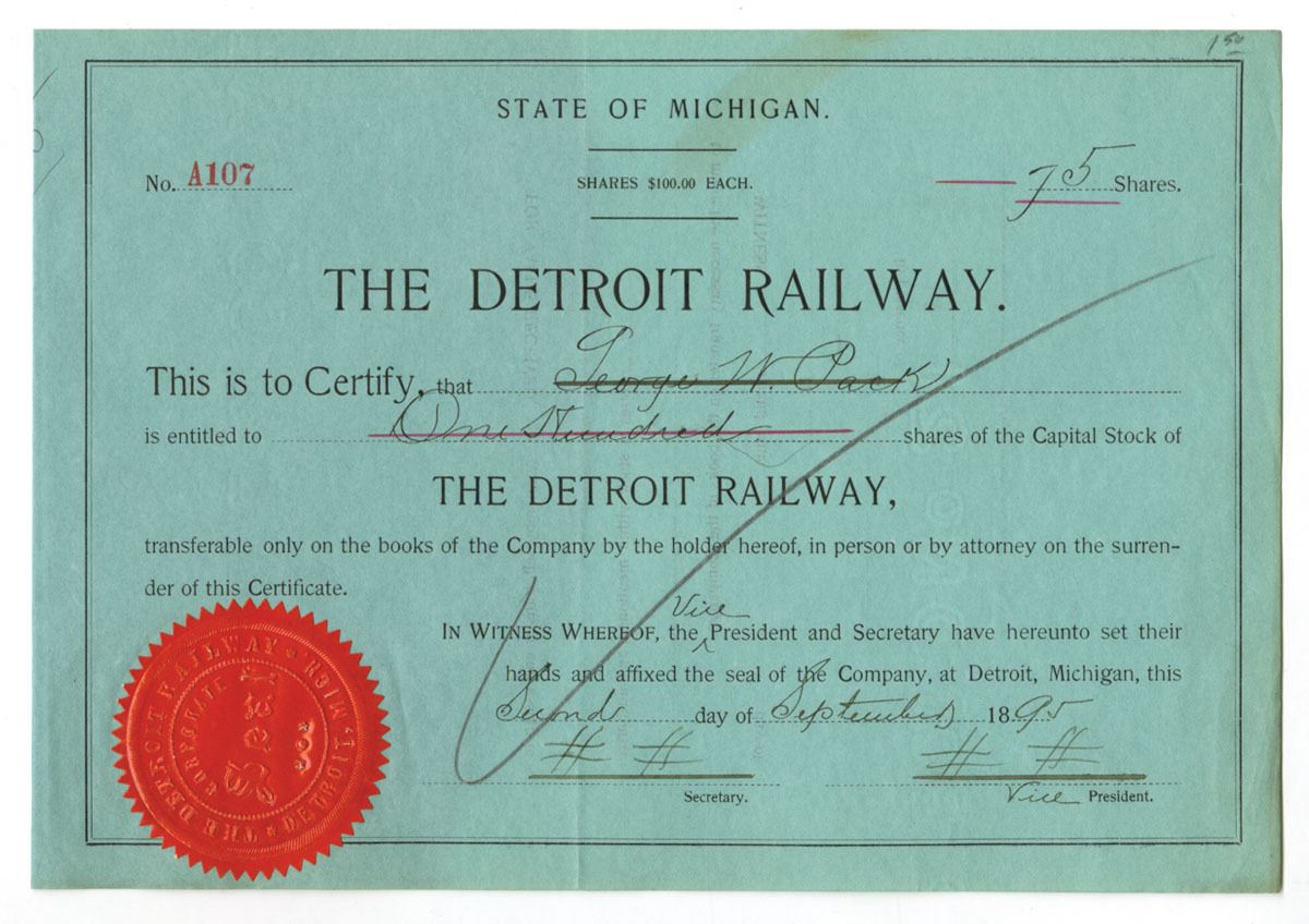 Detroit, Michigan, 1895. 75 Shares Capital Stock I/C Certificate, Black print on blue/green paper with red seal at bottom left corner, Company title at center with large Check mark across center, S/N A107, VF to XF condition with stains.
