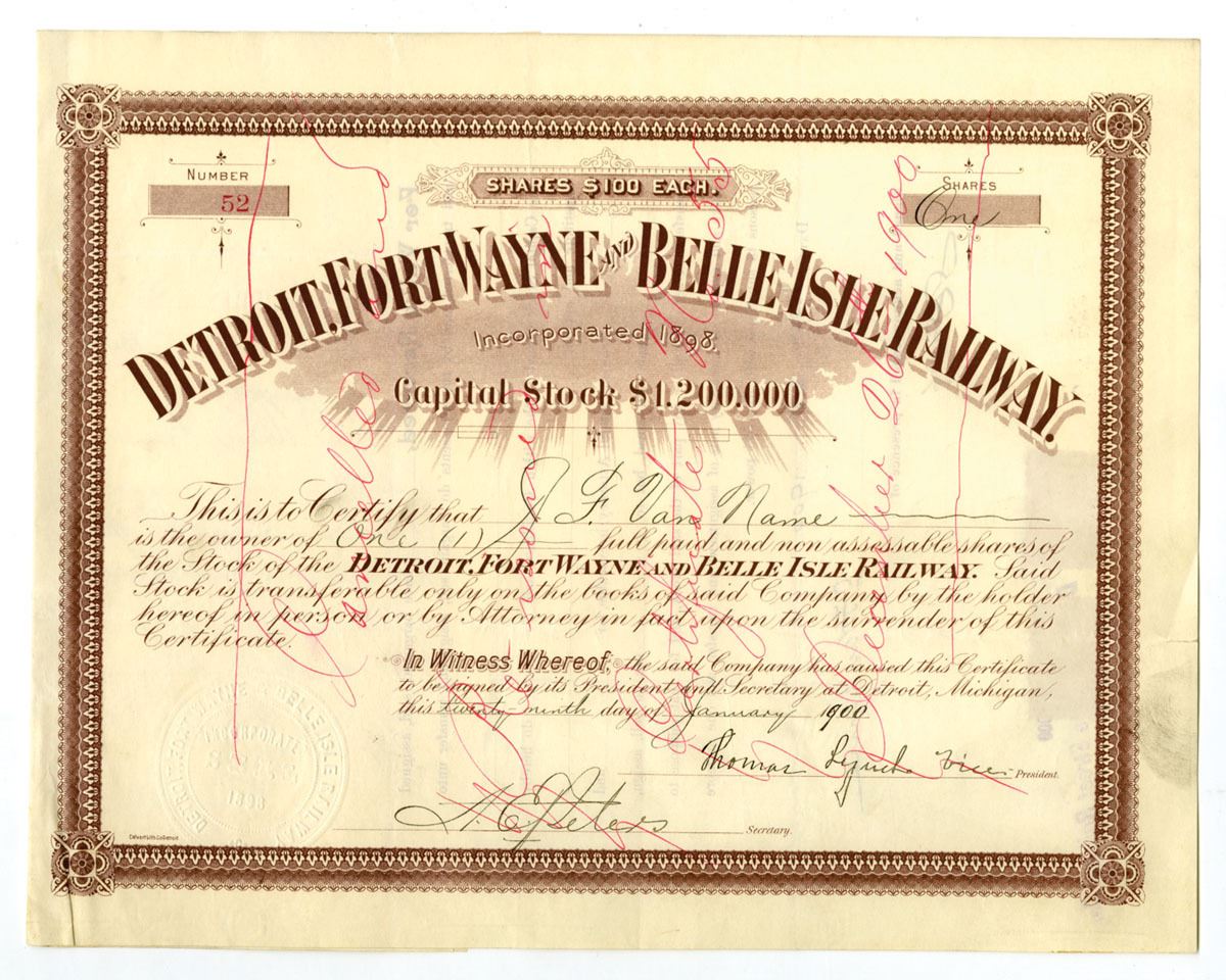 Detroit, Michigan, 1900. 1 Share I/C Stock Certificate, Brown print with brown border, Company title at top center, S/N 52, Hand cancelled across center, VF to XF condition.